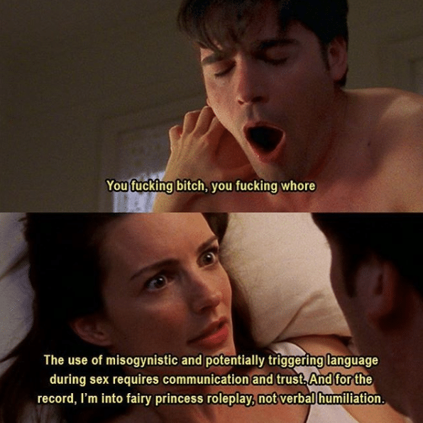 E agli insulti sgradevoli e sessisti da parte di una sua conquista in camera da letto, replica: “L’uso di un linguaggio misogino e potenzialmente stimolante durante il sesso richiede comunicazione e fiducia. E per la cronaca, preferisco i giochi di ruolo in cui sono una principessa, all’umiliazione verbale”.
