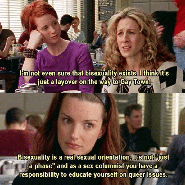 “Non sono neanche sicura che la bisessualità esista. Credo sia solo una sosta prima di raggiungere Gay Town”, sentenzia Carrie Bradshow parlando del ragazzo con cui si sta frequentando, che si è dichiarato bisessuale.