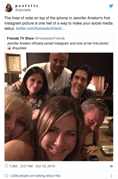Il debutto di Jennifer Aniston su Instagram ha mandato in tilt il social. La prima foto dell’attrice è un selfie insieme agli attori della sit-com Friends. C’è però un dettaglio nell’immagine che non è sfuggito ai fan. “Cocaina!”, scrivono alcuni utenti nei commenti.