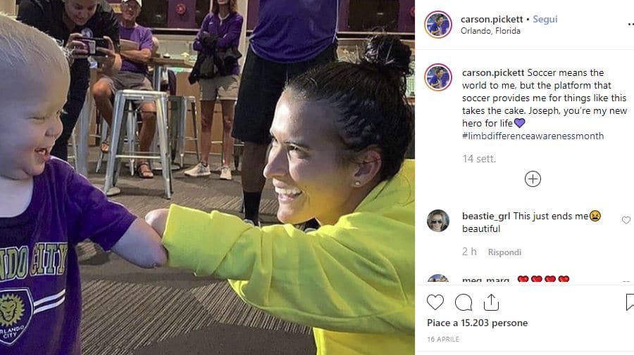 Sulla pagina Tiddbit outta hand, i genitori di Joseph hanno postato la foto del figlio che incontra e schiaccia il “pugno” a Carson Pickett, difensore della squadra di calcio femminile Orlando Pride. Anche la calciatrice è nata senza una mano, e l’incontro tra i due ha commosso migliaia di follower, che hanno condiviso l’immagine, diventata ormai virale.