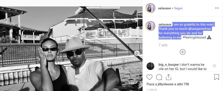 Lo scorso 1 luglio 2019 i due avevano già conhollydiviso una foto che li ritraeva insieme. “Sono così grata a questo uomo! Grazie infinite Jamie Fox per tutto quello che fai e per credere in me”, scriveva Sela Lave su Instagram.