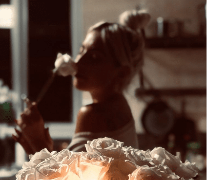 Nella foto Lady Gaga annusa una rosa bianca sullo sfondo e in primo piano c’è un bouquet di rose. La didascalia recita: “Gli italiani cucinano con amore”.