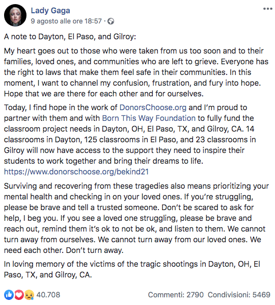 Lady Gaga pubblica un messaggio su Facebook per le vittime delle stragi di El Paso, Gilroy e Dayton