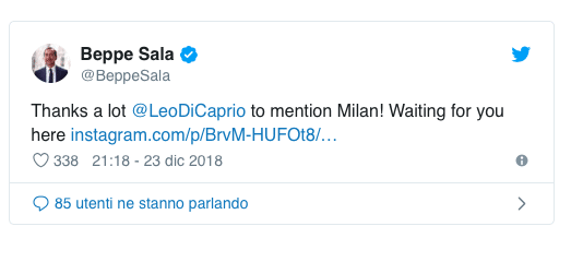 Leonardo DiCaprio ha voluto complimentarsi con la scelta “green” dell’amministrazione milanese ripostando su Instagram il commento di un sito di informazioni ambientaliste corredato di foto delle palme in piazza Duomo a Milano.