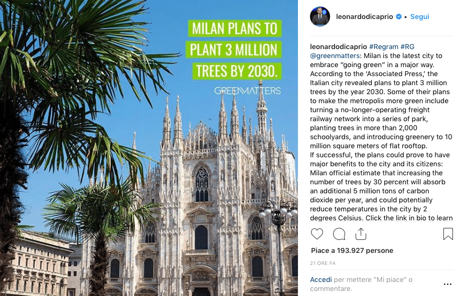 “Più alberi fanno bene ai cittadini”, così Leonardo DiCaprio elogia la città di Milano con un post pubblicato sul suo profilo personale di Instagram.