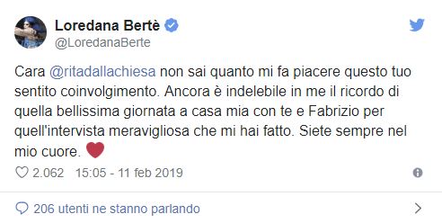 La Berté ha subito risposto all’amica: “Cara @ritadallachiesa non sai quanto mi fa piacere questo tuo sentito coinvolgimento – ha scritto – Ancora è indelebile in me il ricordo di quella bellissima giornata a casa mia con te e Fabrizio per quell’intervista meravigliosa che mi hai fatto. Siete sempre nel mio cuore”. Con una citazione per Fabrizio Frizzi, ex marito della dalla Chiesa scomparso poco tempo fa.