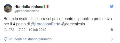Ma la pioggia di critiche non si è placata: Rita dalla Chiesa su Twitter si è indignata per il presunto trattamento riservato a Loredana. “Brutte le risate di chi era sul palco mentre il pubblico protestava per il 4° posto di Loredana Berté”, ha twittato, in riferimento ai tre conduttori.