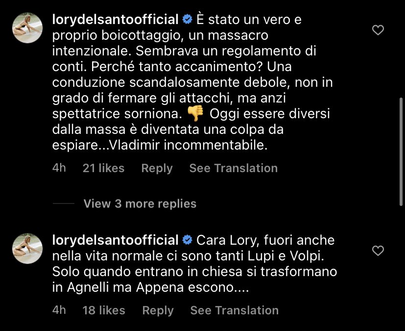 Questi messaggi stonano un po’ con la spiegazione fornita dallo staff della Lory Del Santo, che aveva precisato “che la signora Lory Del Santo, attualmente in Honduras, non è in possesso di uno smartphone. Si vuole precisare che i commenti effettuali dall’account della signora Del Santo sono stati pubblicati in buona fede dallo staff al solo scopo di documentare la riconoscenza dei fan che è stata dimostrata nei direct”.