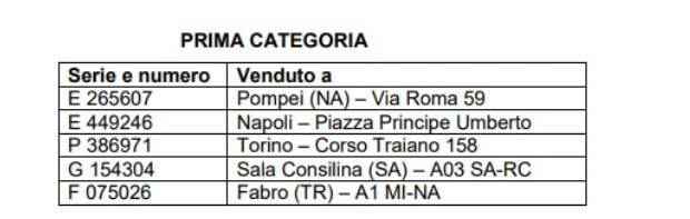 L’Agenzia Dogane e Monopoli comunica le serie e i numeri dei biglietti estratti di Prima categoria e non ancora abbinati ai premi: Serie E numero 265607 venduto a Pompei (Napoli), in punto vendita Via Roma 59; Serie E numero 449246 venduto a Napoli – Piazza Principe Umberto; Serie P numero 386971 venduto a Torino – Corso Traiano 158; serie G numero 154304 venduto a Sala Consilina (Salerno) in stazione servizio dell’autostrada A03 Salerno-Reggio Calabria; Serie F numero 075026 venduto a Fabro (Terni) in stazione servizio dell’autostrada A1 Milano-Napoli.