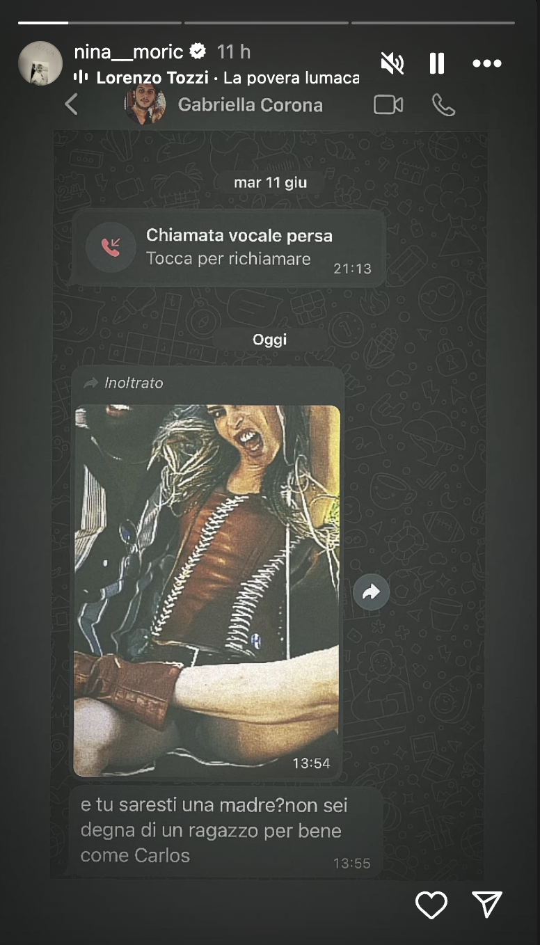 Nel messaggio, pubblicato tra le stories Instagram di Nina Moric, Gabriella Corona allega una foto che mostra la modella con un corpetto attillato e un paio di mini short neri in cui scrive: “E tu saresti una madre? Non sei degna di un ragazzo per bene come Carlos”.