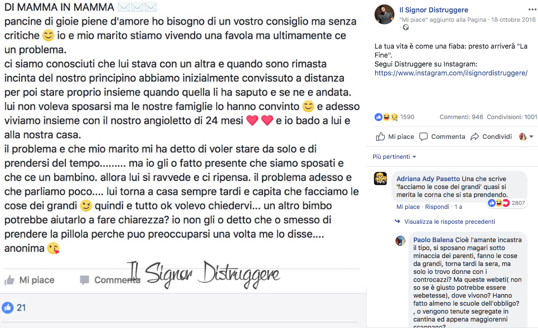 Sulla sua pagina “Il Signor Distruggere” conta oltre 800mila fan e spesso pubblica screenshot di conversazioni prevenienti dai gruppi delle mamme pancine.