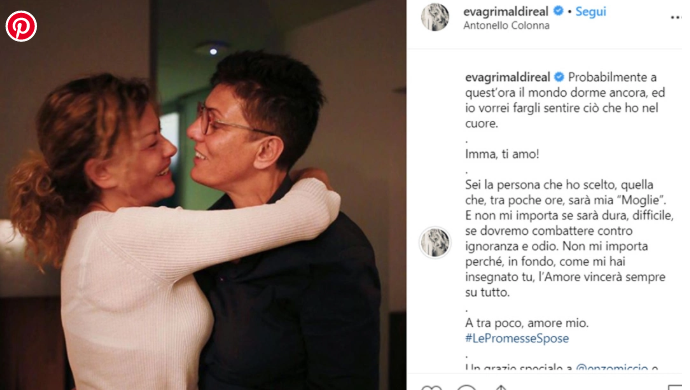 La dedica su Instagramè dolcissima: “Sei la persona che ho scelto, quella che, tra poche ore, sarà mia ‘moglie’. Probabilmente a quest’ora il mondo dorme ancora, ed io vorrei fargli sentire ciò che ho nel cuore. Imma, ti amo! E non mi importa se sarà dura, difficile, se dovremo combattere contro ignoranza e odio. Non mi importa perché, in fondo, come mi hai insegnato tu, l’Amore vincerà sempre su tutto. A tra poco, amore mio”.