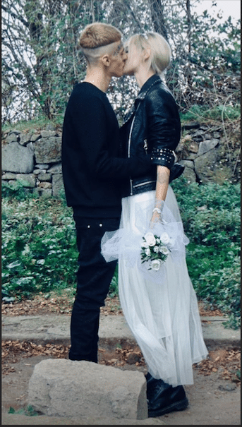 Nelle Stories del trapper si vedono alcuni momenti della celebrazione e si svelano gli abiti indossati dagli sposi: abiti neri per lui, giacca di pelle, anfibi e abito bianco per lei.