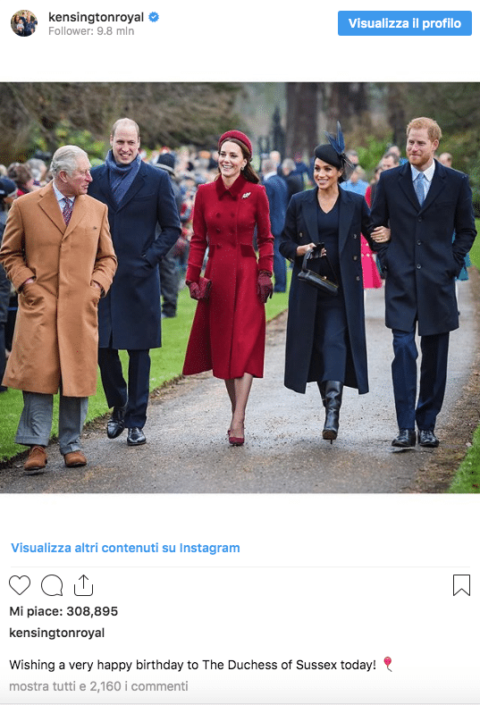 Anche Kate e William hanno fatto i loro auguri alla cognata, postando sul loro account Instagram una foto che li ritrae tutti e quattro assieme, più il principe Carlo, mentre si avviano alla messa di Natale nella tenuta di Sandringham.