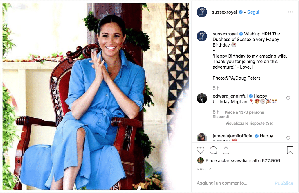 “Felicissimo compleanno alla duchessa di Sussex”, si legge nel post su Instagram.