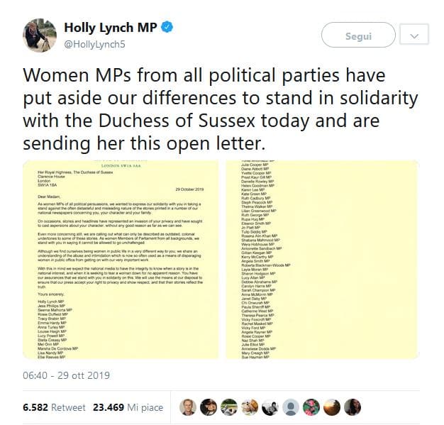 Nessuna bandiera politica sulla scelta delle deputate di dire la loro sulla duchessa di Sussex. A firmare la lettera, infatti, sono state deputate appartenenti a diversi partiti. Quello che denunciano le parlamentari è che la stampa britannica nei confronti di Meghan Markle ha usato toni e parole sbagliate, denigrando lei e la sua famiglia in modo del tutto gratuito.