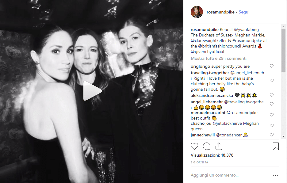 Sempre nel protocollo rigido si specifica che le donne di casa Windsor possano tingere le loro unghie solo con colori tenui, possibilmente rosa pallido. Quello che però avrebbe mandato la regina Elisabetta su tutte le furie sarebbe stato quel selfie pubblicato sull’account Instagram dell’amica Rosamund Pike, insieme a Clare Waight Keller. Il divieto di pubblicare scatti che non siano in occasione di eventi ufficiali è chiaro e consolidato ormai da tempo. Forse Meghan ha dimenticato questa regola. Fatto sta che ora dovrà impegnarsi da capo per rientrare nelle grazie di nonna Elisabetta.