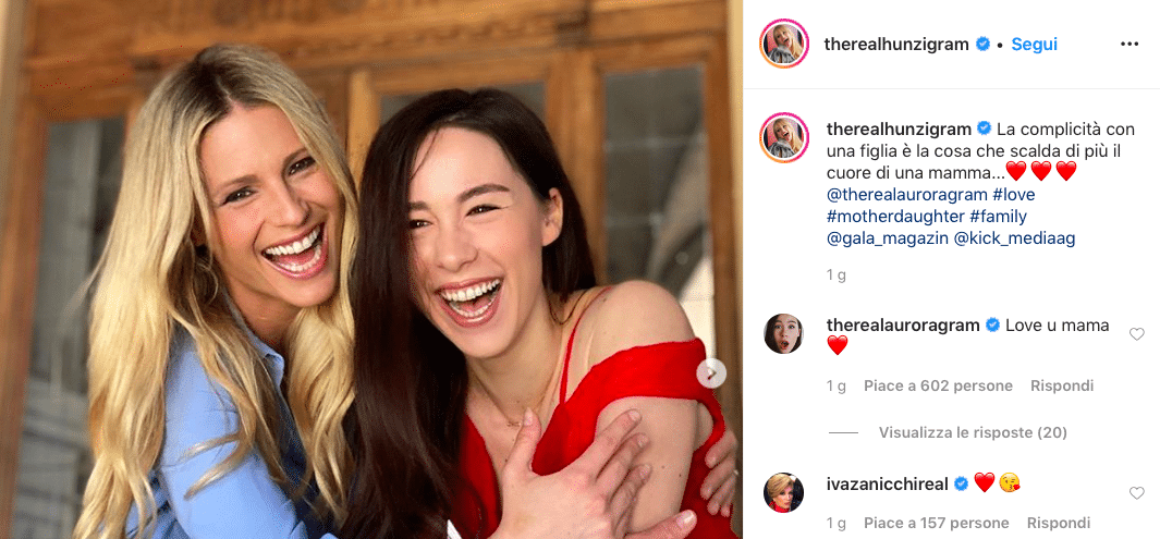 Michelle Hunziker (43 anni) in una recente intervista rilasciata ai microfoni del settimanale tedesco ‘Gala Magazine’ ha raccontato il bellissimo rapporto che ha con la figlia Aurora Ramazzotti (23 anni). Un legame sincero tra madre e figlia che viene spesso mostrato sui social. L’ultimo post Instagram di Michelle è infatti dedicato ad Aurora: “La complicità con una figlia è ciò che scalda di più il cuore di una mamma”.