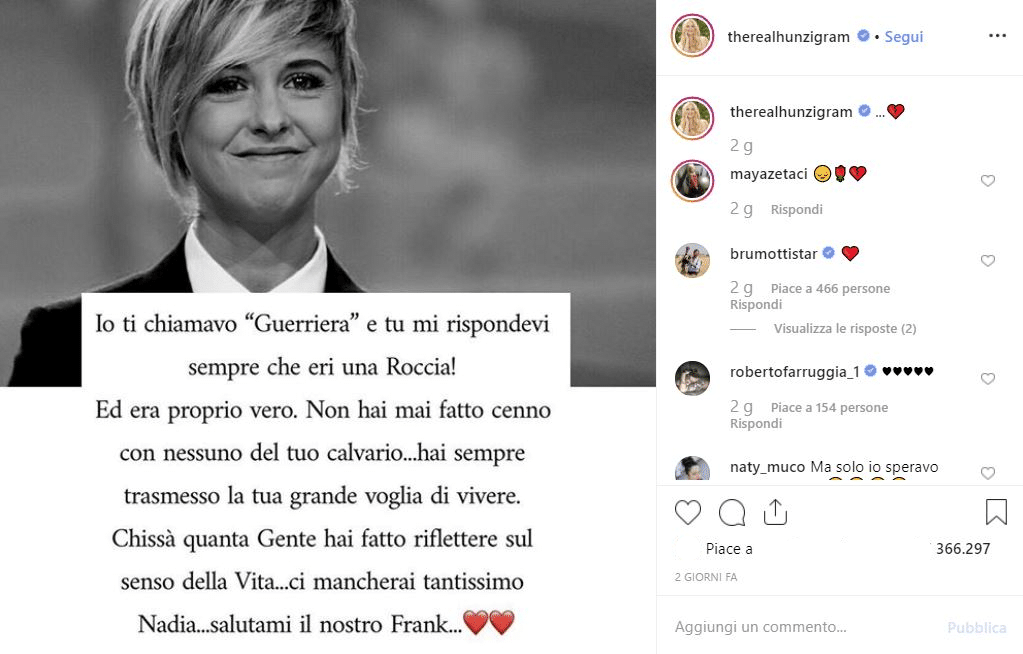 “Io ti chiamavo ‘Guerriera’ e tu mi rispondevi sempre che eri una Roccia! Ed era proprio vero. Non hai mai fatto cenno con nessuno del tuo calvario… Hai sempre trasmesso la tua grande voglia di vivere. Chissà quanta gente hai fatto riflettere sul senso della Vita… ci mancherai tantissimo Nadia… salutami il nostro Frank!”.