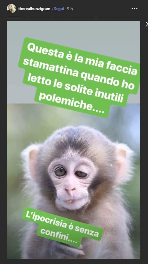 Qualche ora dopo, in una storia, Hunziker ha spiegato il suo stato d’animo: “Questa è la mia faccia stamattina quando ho letto le solite, inutili polemiche. L’ipocrisia è senza confini…”