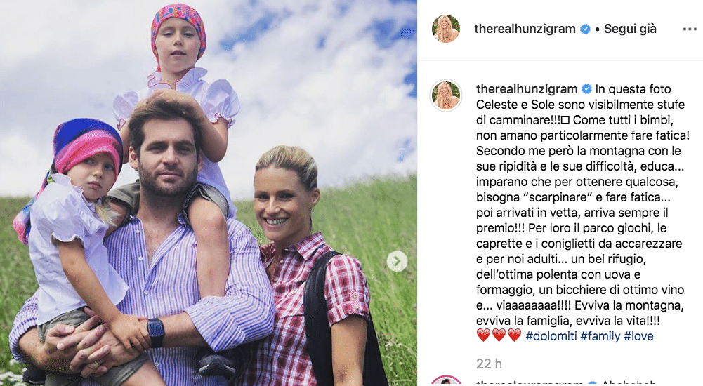 “In questa foto Celeste e Sole sono visibilmente stufe di camminare – scrive Michelle Hunziker in un post Instagram – Come tutti i bimbi, non amano particolarmente fare fatica! Secondo me però la montagna con le sue ripidità e le sue difficoltà, educa”.