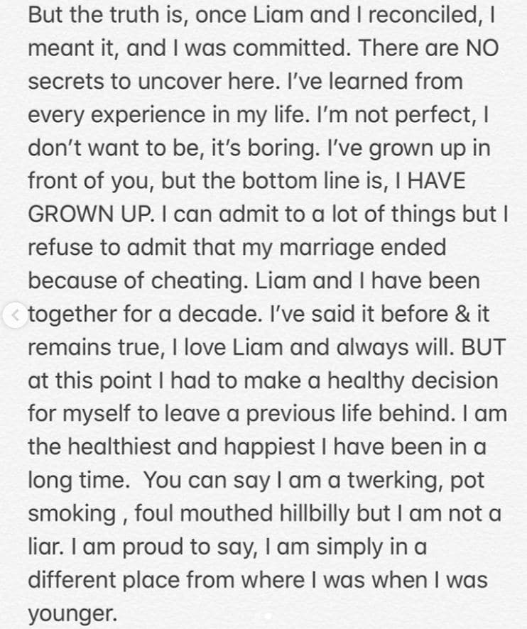 “Ma la verità è che, quando io e Liam ci siamo rimessi insieme, ci credevo davvero e ci ho messo tutta me stessa. Non ci sono segreti da nascondere. Ho imparato da ogni esperienza della mia vita. Non sono perfetta, non voglio esserlo, è noioso. Sono cresciuta di fronte a voi ma la cosa che dovete considerare è che SONO CRESCIUTA. Posso ammettere tante cose ma mi rifiuto di ammettere che il mio matrimonio sia finito per dei tradimenti. Io e Liam siamo stati insieme per dieci anni. L’ho detto in passato e lo ribadisco, amo Liam e lo amerò per sempre. MA a questo punto devo prendere la decisione più salutare per me stessa di lasciare il passato alle spalle. Non ero così felice e in salute da molto tempo. Potete dire che sto twerkando, fumando, che sono una maleducata, ma non sono una bugiarda. Sono fiera di dire che sono semplicemente un’altra persona rispetto a quando ero più giovane”, conclude la cantante e attrice.