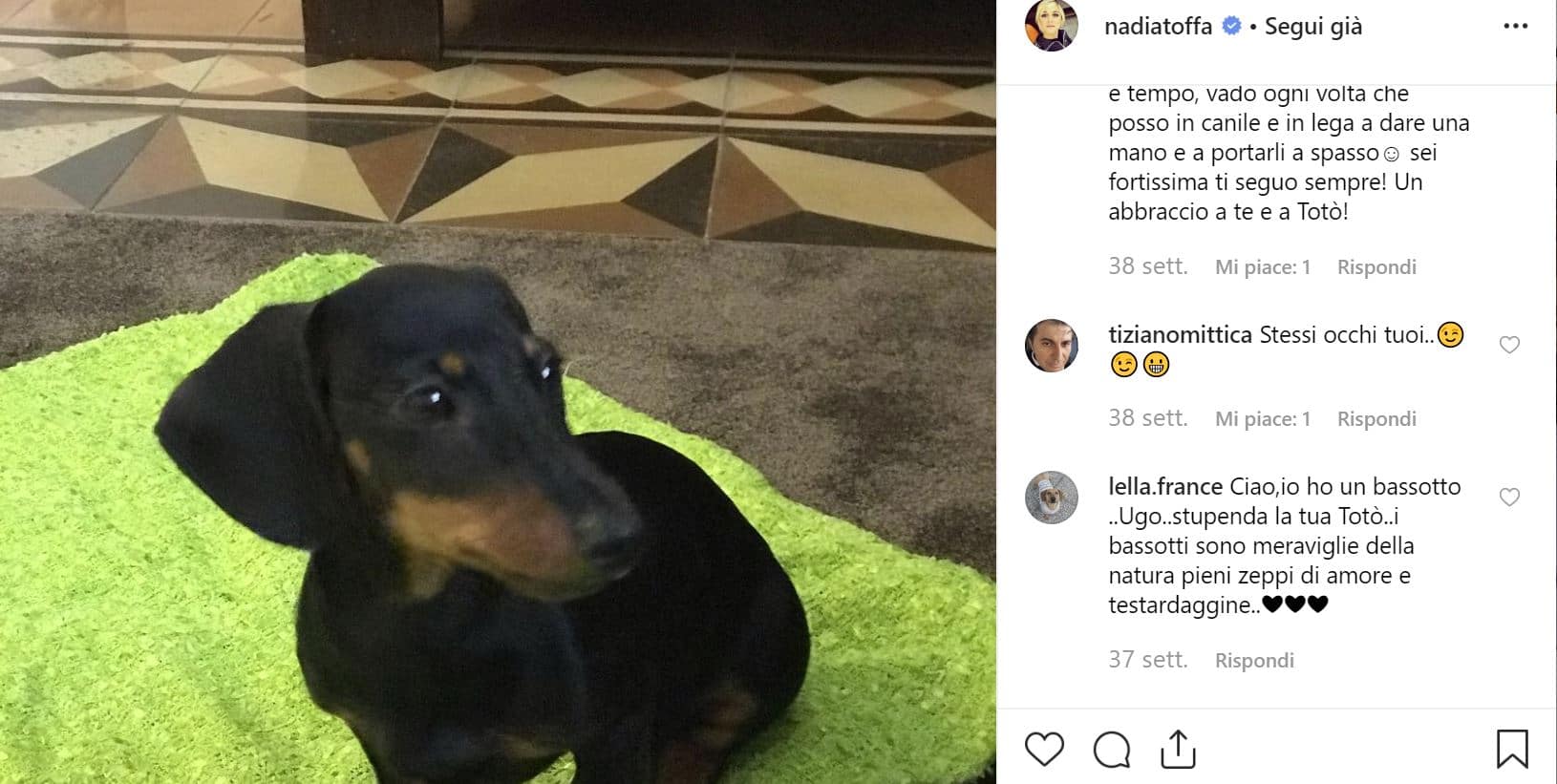 “Qualcuno mi sa dire come sta la sua cagnolina Totó? Anche a lei, Nadia mancherà come l’aria. Abbraccio tutta la famiglia Toffa, colpita 2 volte, con il cuore colmo di amore”, scrive un utente social a commento dell’ultima immagine condivisa dalla giornalista insieme a Totò.
