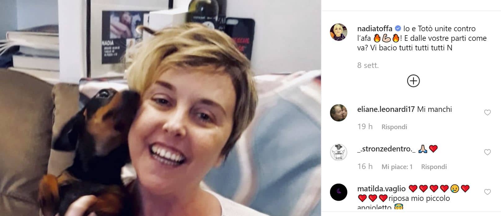 Ed è sempre con lei che si è fotografata nell’ultimo post condiviso il 1 luglio, prima della scomparsa. Nadia Toffa scriveva: “Io e Totò unite contro l’afa. E dalle vostre parti come va? Vi bacio tutti”. Nella foto, Nadia Toffa appariva abbracciata alla sua cagnolina.