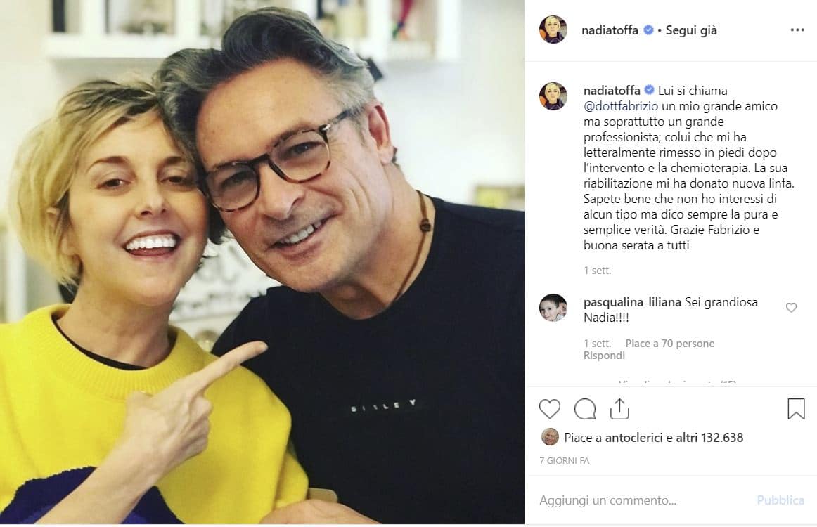 Nello scatto compariva insieme a un medico: “Lui si chiama @dottfabrizio un mio grande amico ma soprattutto un grande professionista; colui che mi ha letteralmente rimesso in piedi dopo l’intervento e la chemioterapia. La sua riabilitazione mi ha donato nuova linfa. Sapete bene che non ho interessi di alcun tipo ma dico sempre la pura e semplice verità. Grazie Fabrizio e buona serata a tutti”, scriveva accanto alla foto.
