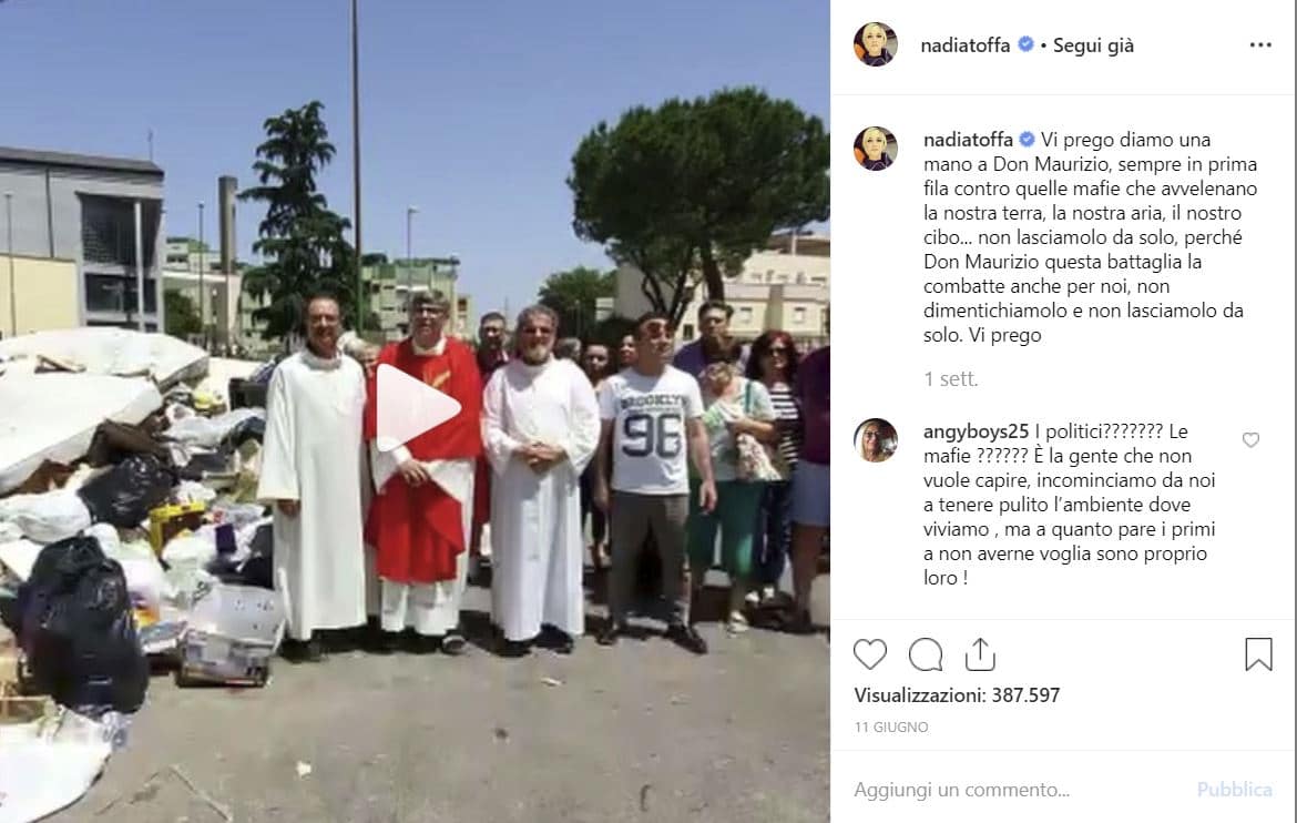 Nell’ultimo post, pubblicato lo scorso 17 giugno, Nadia Toffa lanciava un appello disperato: la presentatrice di Mediaset chiedeva ai suoi sostenitori di aiutare un parroco campano che quotidianamente si batte nella terra dei fuochi: “Vi prego diamo una mano a Don Maurizio, sempre in prima fila contro quelle mafie che avvelenano la nostra terra, la nostra aria, il nostro cibo… non lasciamolo da solo, perché Don Maurizio questa battaglia la combatte anche per noi, non dimentichiamolo e non lasciamolo da solo. Vi prego”, scriveva Nadia Toffa.