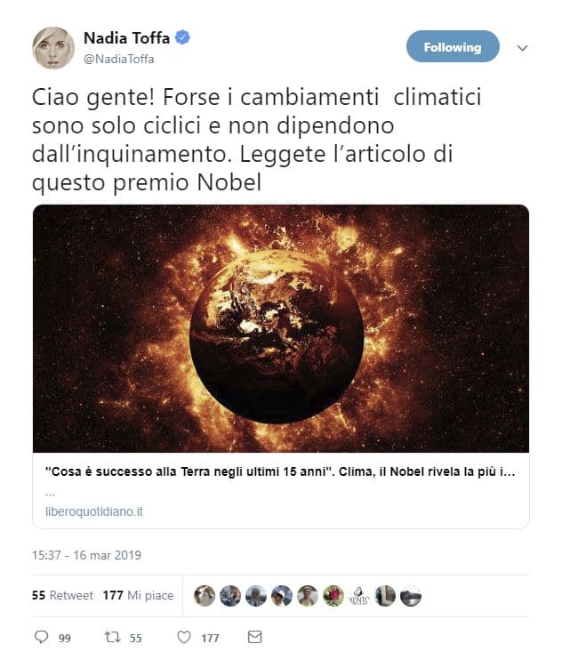 “Nadia, ti prego, ma stai impazzendo? Io davvero stento a credere che una come te accetti i cambiamenti climatici senza credere agli avvertimenti degli scienziati. Sono senza parole ormai da ieri, profondamente deluso”, scrive qualcuno. “Io ti suggerirei di andare sul Sito della Nasa sui cambiamenti climatici, invece di leggere porcherie di Destra di altrettanto pennivendoli. Il Nobel non dice proprio quelle parole in realtà”, si legge in un altro commento. “Ah fai parte dell’elite complottista che nega il cambiamento climatico, praticamente una trumpiana! Ah”, scrive un altro. “Nadia purtroppo il cambiamento climatico non è un’invenzione. Rubbia dice giustamente che le emissioni di CO2 sono aumentate esponenzialmente. Siamo noi la causa, che ci piacciao o no”, risponde un altro utente.