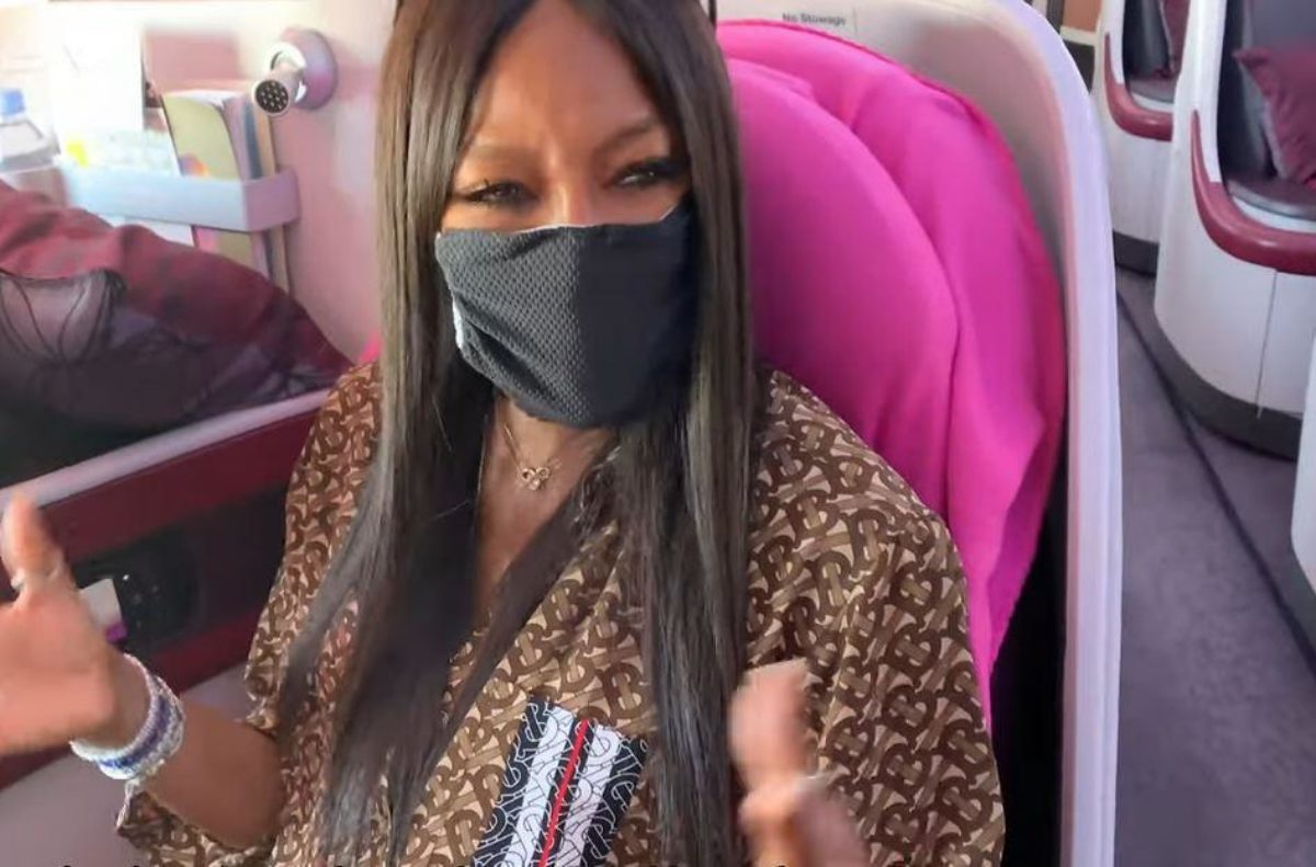 Naomi Campbell: bye bye microbi. La modella come non l’avete mai vista in aereo