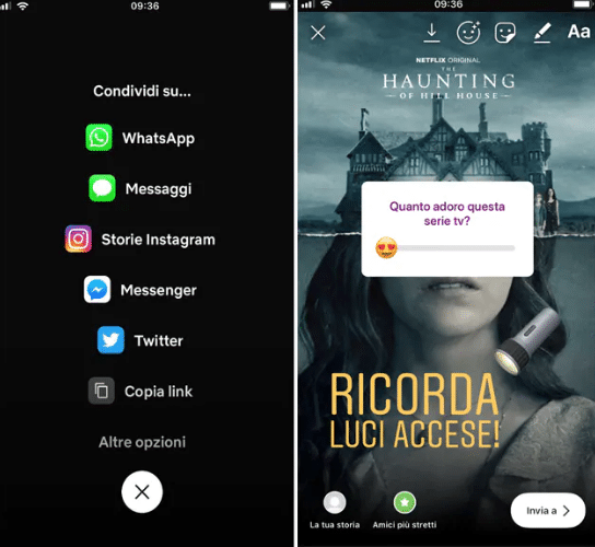La procedura è semplice: scarica l’applicazione mobile Netflix, scegli la serie tv o il film che più hai apprezzato e clicca su “Condividi”. Dall’elenco delle app scegli “Storie Instagram” o “Instagram stories” e il gioco è fatto.