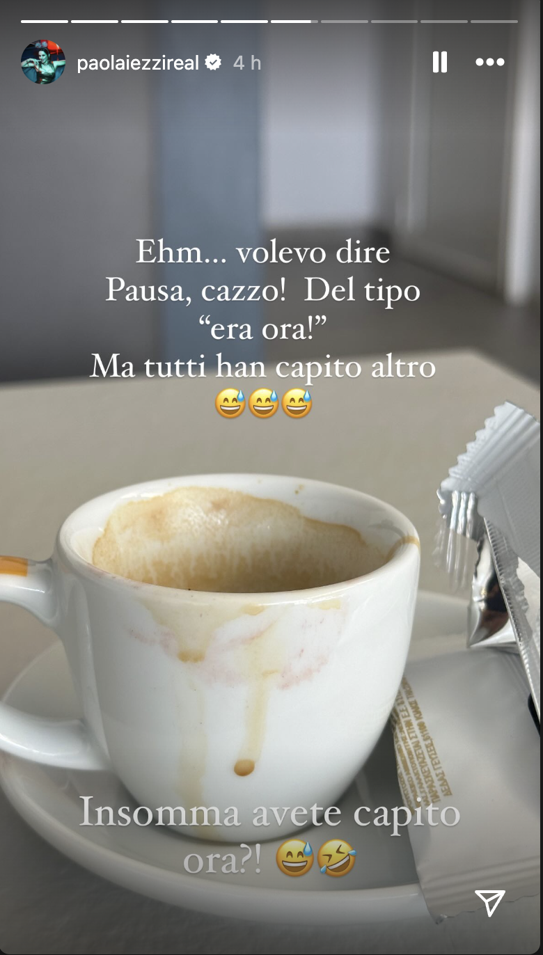L’interprete deve aver ricevuto subito diversi messaggi visto che, poco dopo, ha aggiunto una nuova foto, raffigurante sempre una tazzina di caffè, in cui rettificava: “Ehm.. volevo dire ‘Pausa, cazzo!’. Del tipo ‘era ora’. Ma tutti hanno capito altro. Insomma avete capito ora?”.
