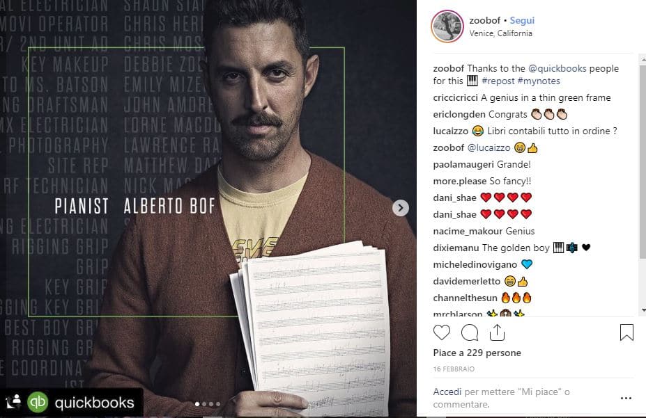 Alberto Bof è un pianista e produttore musicale genovese che vive e lavora a Los Angeles. Oltre ad apparire nel film “A Star Is Born” come pianista della band di Jack, il cantante interpretato da Bradley Cooper, Alberto Bof ha contribuito alla stesura di cinque brani della colonna sonora, incidendo in particolare Black Eyes e Digging My Grave.
