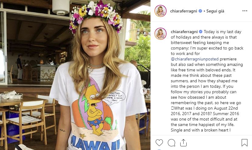 “Oggi è il mio ultimo giorno di ferie e c’è sempre quella sensazione agrodolce che mi tiene compagnia: sono super entusiasta di tornare al lavoro e per per la premiere di Chiara Ferragni Unposted, ma anche triste quando qualcosa di straordinario come il tempo passato insieme alle persone che amo volge al termine. Ho pensato quindi alle scorse estati e alla donna che sono diventata oggi”, scrive Chiara Ferragni nel suo post su Instagram.