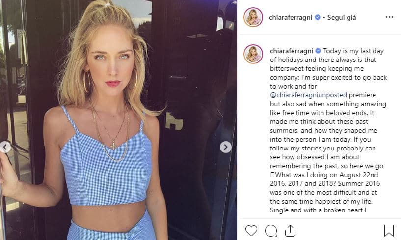 Chiara Ferragni si abbandona e una lunga riflessione, in cui ricorda le estati precedenti, dal 2016 al 2018, e racconta ai suoi fan quello che stava facendo e perché per lei le vacanze sono un momento unico e importante per la crescita personale e professionale.
