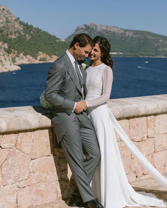 I due sorridono abbracciati, dietro di loro lo spettacolo dell’isola spagnola su cui il campione è nato e dove i due hanno voluto celebrare le loro nozze dopo una vita insieme. L’abito di lei è stato firmato da Rosa Clará, mentre il tennista ha indossato un abito sartoriale di Brunello Cucinelli.