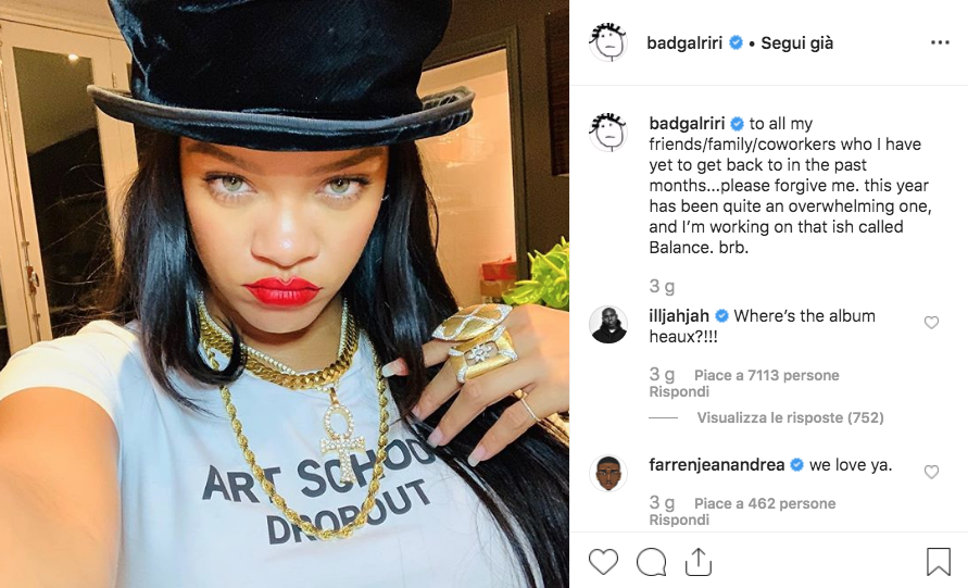 Rihanna lascia Instagram per un po’, lo ha annunciato la stessa cantante sul suo profilo badgalriri. “Scusatemi, ho bisogno di staccare”, scrive. Lasciando intendere che non sta attraversando un buon momento. Oppure si tratta soltanto di una trovata pubblicitaria per lanciare il suo nuovo album?