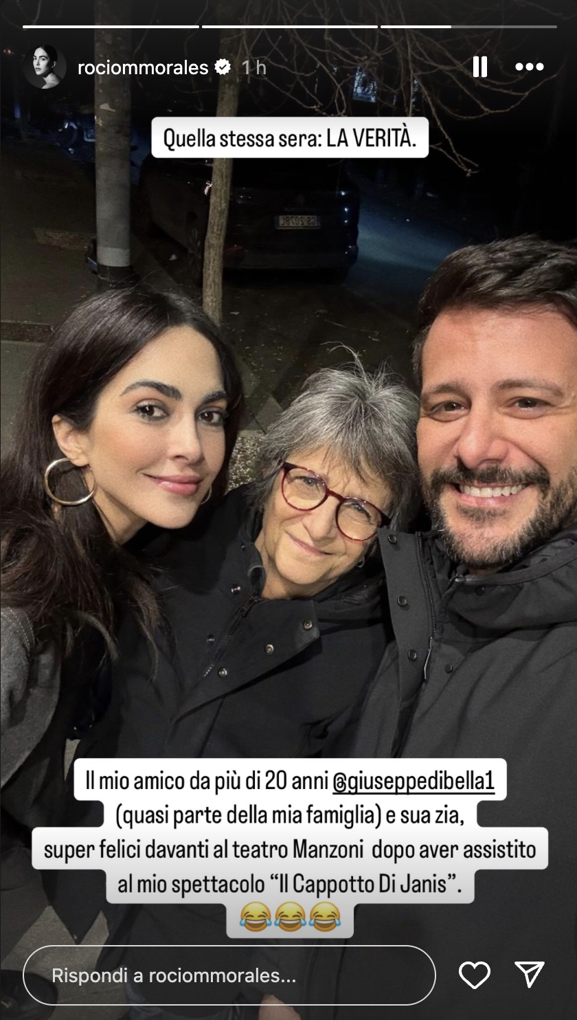 “Il mio amico da più di 20 anni Giuseppe Di Bella (quasi parte della mia famiglia) e sua zia. Super felici davanti al teatro Manzoni dopo aver assistito al mio spettacolo Il cappotto Di Janis. Una smentita che serve anche a mettere a tacere le indiscrezioni che volevano Rocio in crisi con il compagno Raoul Bova. Era stato sempre il settimanale Diva e Donna a scrivere: “La favola d’amore è finita: sono in crisi e vivono già da separati in casa”.