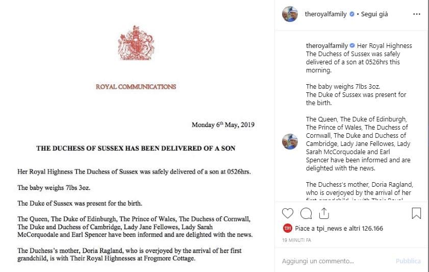 Royal Baby nato Instagram – “Siamo lieti di annunciare che le altezze reali Il Duca e la Duchessa di Sussex hanno dato il benvenuto al loro primogenito al mattino presto, il 6 maggio 2019. Il figlio della loro altezza reale pesa più di tre chili. La Duchessa e il bambino sono sani e stanno bene, e la coppia ringrazia tutti per la loro comune eccitazione e il sostegno durante questo momento molto speciale della loro vita. Maggiori dettagli saranno condivisi nei prossimi giorni”. Così il principe Harry e Meghan Markle sul loro account Instagram hanno annunciato la nascita del loro bambino.