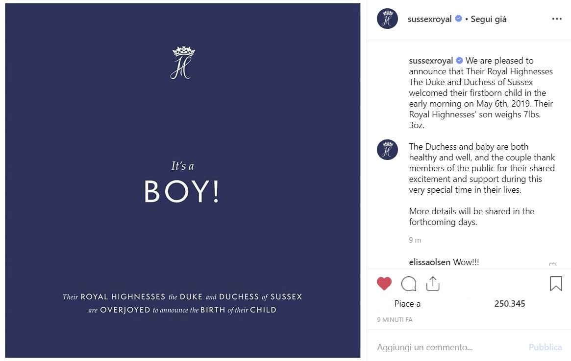 E così i reali ai tempi di Instagram hanno dato notizia ai sudditi della nascita del primogenito dei duchi di Sussex.