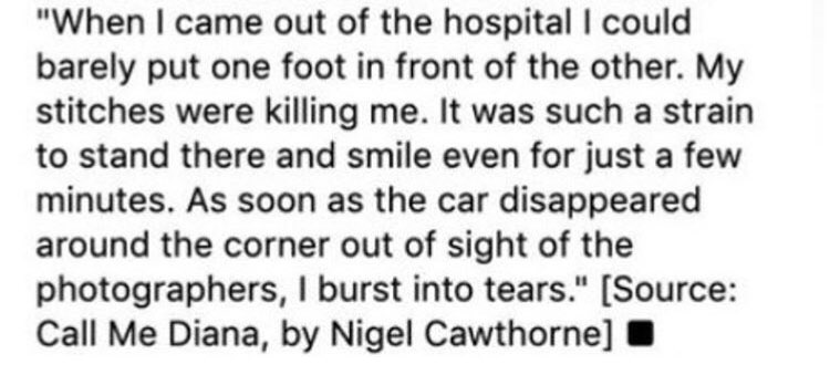 “Quando uscii dall’ospedale ho potuto appena mettere un piede fuori dall’ospedale. I punti mi stavano uccidendo. Era così difficile stare lì e sorridere, anche solo per pochi minuti. Non appena l’auto è scomparsa dietro l’angolo, fuori dalla vista dei fotografi, sono scoppiata in lacrime”. La testimonianza è stata tratta da Call me Diana di Nigel Cawthorne.