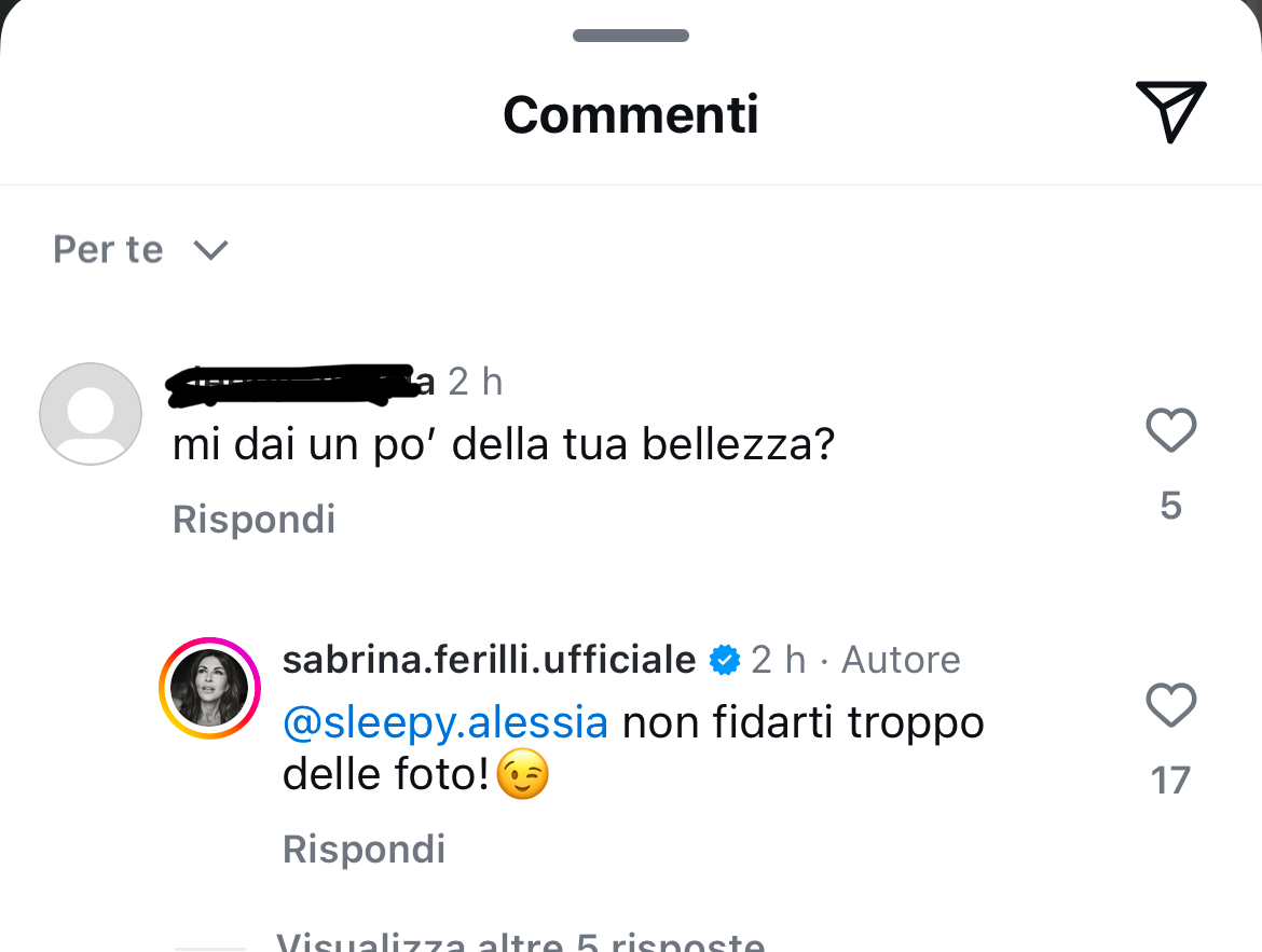 Le foto sono state particolarmente apprezzate dai follower che hanno iniziato a fare i complimenti all’attrice. In particolare, una fan, ha scritto: “Mi dai un po’ della tua bellezza?”. Sabrina Ferilli, però, a sorpresa ha così replicato: “Non fidarti troppo delle foto”.