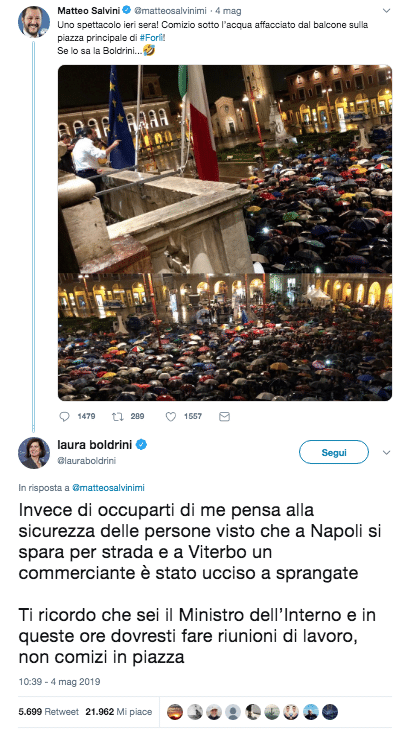 Continua la sfida social tra Laura Boldrini, ex presidente della Camera, e Matteo Salvini, ministro dell’Interno e vicepresidente del Consiglio. A colpi di tweet i due si demoliscono a vicenda sulla piazza virtuale di Twitter e Facebook, dove a primeggiare però non è il leader leghista bensì la esponente della sinistra.