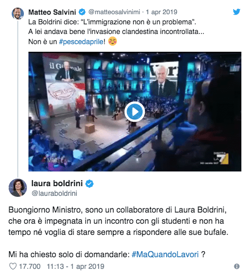 Ma la Boldrini è un mese che vince su Salvini. Il primo di aprile il vicepremier twitta: “La Boldrini dice che l’immigrazione non è un problema a lei andava bene l’invasione clandestina incontrollata… Non è un #pescedaprile”.