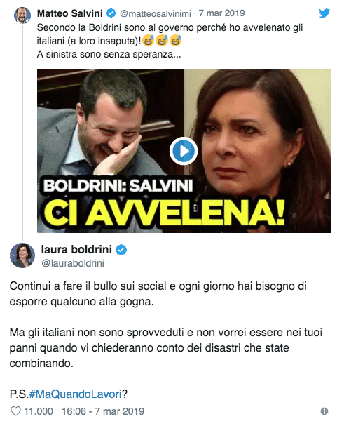 Qualche giorno dopo arriva un altro attacco del ministro dell’Interno alla leader dem. Il 7 aprile Salvini scrive: “Secondo la Boldrini sono al governo perché ho avvelenato gli italiani (a loro insaputa)!😅😅😅 A sinistra sono senza speranza”.