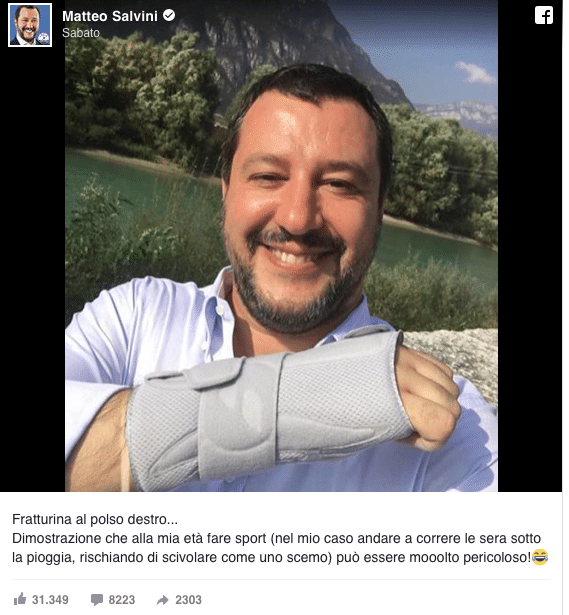 Nella didascalia del selfie Salvini scrive: “Fratturina al polso destro… Dimostrazione che alla mia età fare sport (nel mio caso andare a correre la sera sotto la pioggia, rischiando di scivolare come uno scemo) può essere mooolto pericoloso!”.