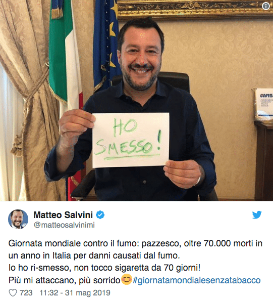 Salvini su Twitter ha dichiarato: “Giornata mondiale contro il fumo: pazzesco, oltre 70.000 morti in un anno in Italia per danni causati dal fumo. Io ho ri-smesso, non tocco sigaretta da 70 giorni!”.