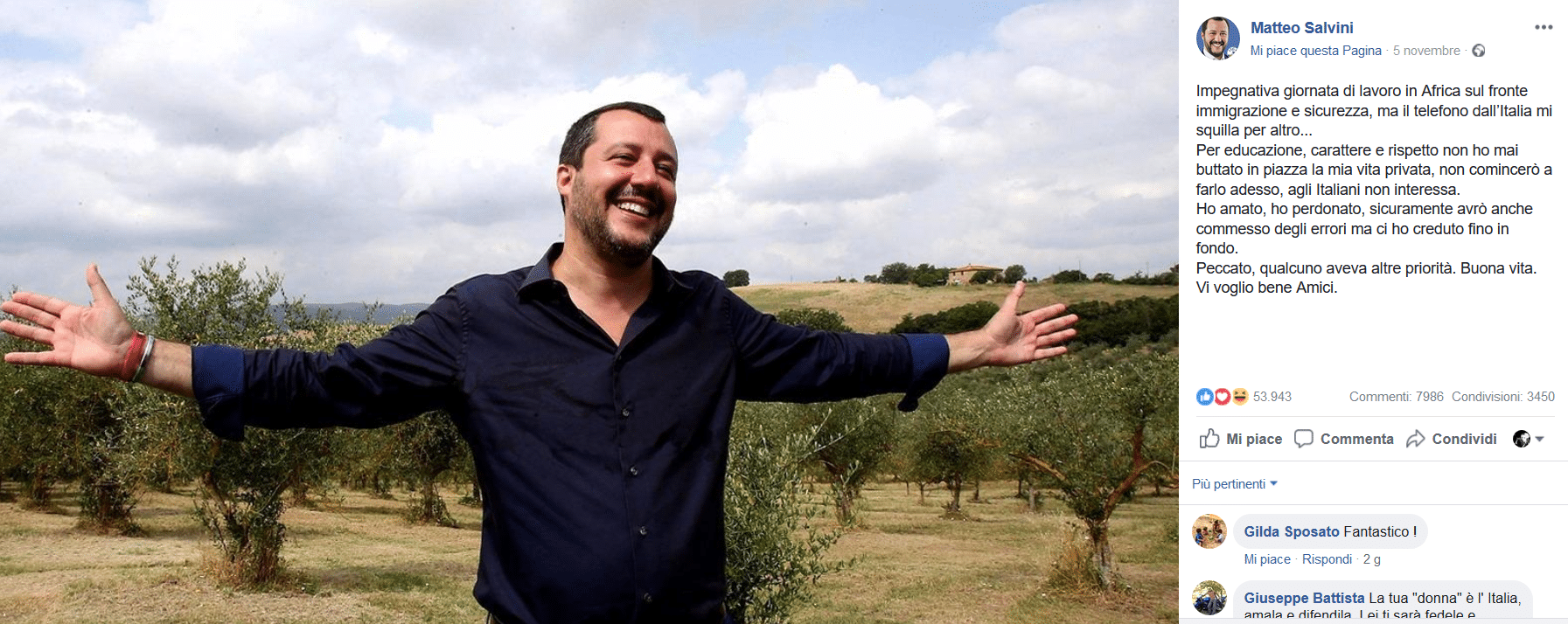 La prima replica del vicepremier arriva il 5 novembre in tarda serata. “Impegnativa giornata di lavoro in Africa sul fronte immigrazione e sicurezza, ma il telefono dall’Italia mi squilla per altro… Per educazione, carattere e rispetto non ho mai buttato in piazza la mia vita privata, non comincerò a farlo adesso, agli Italiani non interessa. Ho amato, ho perdonato, sicuramente avrò anche commesso degli errori ma ci ho creduto fino in fondo. Peccato, qualcuno aveva altre priorità. Buona vita. Vi voglio bene Amici”, ha scritto su Facebook Salvini, che lascia intendere di averci provato fino alla fine.